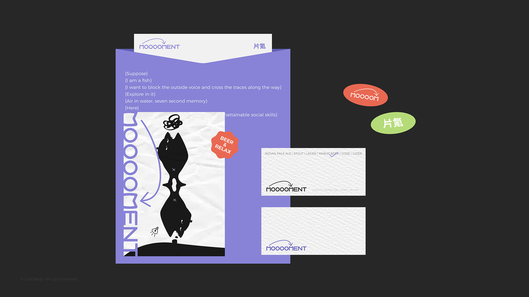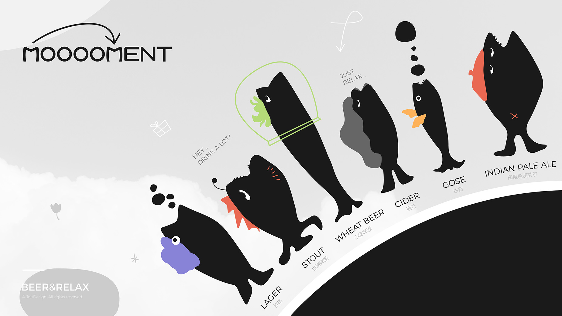 我们在设计中将非人类对象赋予人类特征和情感,使其具有更强的视觉冲击力和情感共鸣。以拟人化的鱼作为IP形象,通过简洁、现代的线条和色彩设计,突出它的个性化。 在这里,可以放下包袱,与朋友们尽情畅谈,大口喝酒,释放压力,享受每一个瞬间。