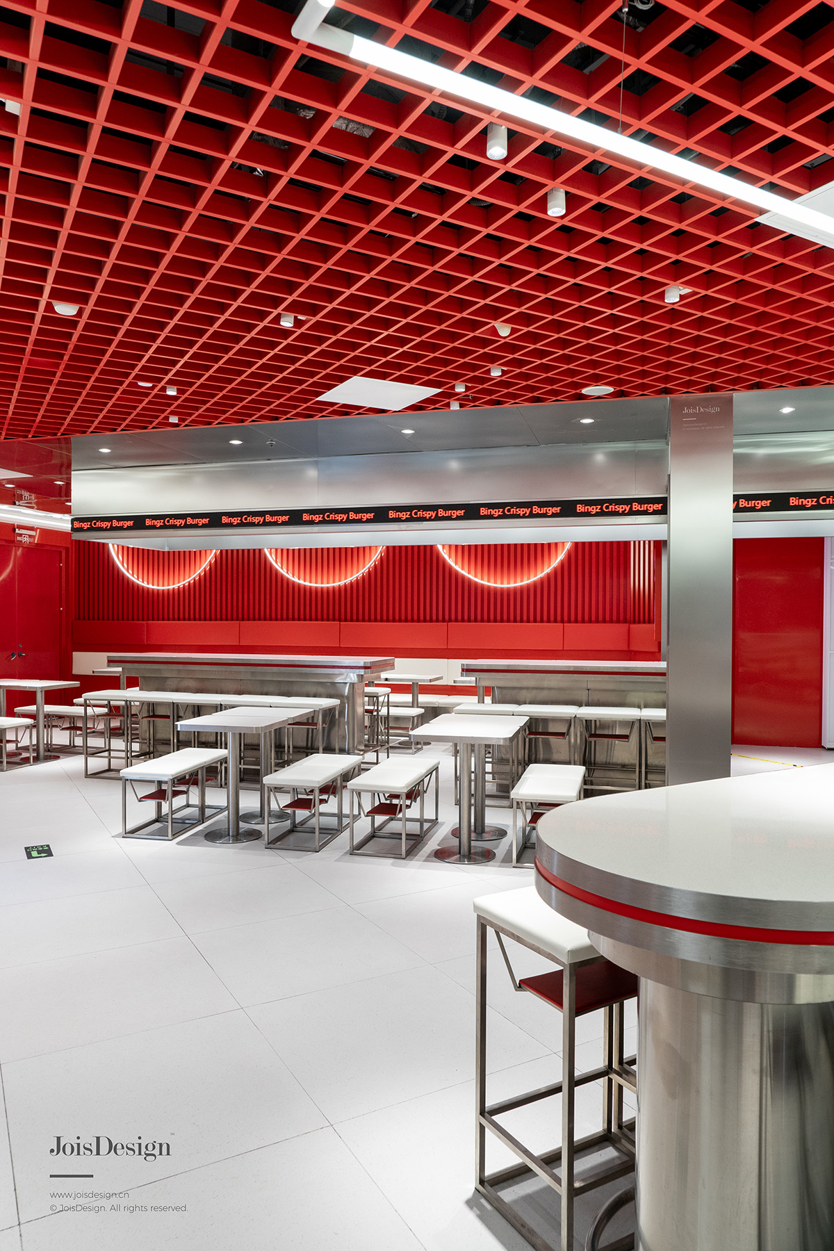 对于异形空间,如何最大化利用空间的同时起到视觉引导作用,在此次项目中得到了验证。该项目前期是一家连锁超市,超市功能与餐饮空间完全不同,设计师起初测量发现了很多利用率不高的三角区域,拆除后原结构虽然不是方方正正的空间,但设计师发现原建筑最大斜边与商场进入店铺动线平行,且无遮挡,这无疑是先天的优势,所以设计师在室内平行于斜边做了一个长方体装置,利用形体将空间的斜边进行二次强化,将劣势转为视觉引导的优势,让进入商场的客流第一时间看到店铺,做到吸引客流的作用,同时门头尺寸缩小,下半部分为不遮挡长方形盒体体量感,做了透明材质,材质为了整体协调性选用了红色亚克力。