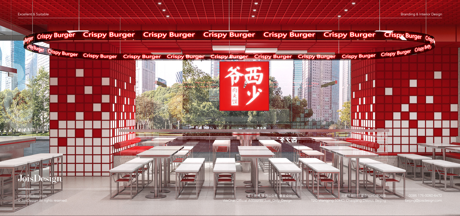 空间设计上,设计师以西少爷品牌自有的企业图案(红白格子),进行延展设计,利用空间原有通透性,将红白格子以金属和亚克力的质感直接呈现在墙面造型上,以直接的视觉冲击力给予人们明确的记忆点,利用毗邻街道的优势,人来人往间不断吸引周边人群,刺激消费。空间划分上东西向分为三段,保证入口和次入口视线和造型上的连贯,东西两侧吊顶与中间吊顶高差40厘米,中间吊顶用铝格栅红色吊顶,纵向空间更具通透性和丰富性,层次更加鲜明。墙面细节上将红色方格精细化处理,红色金属板折边处理,增加细节,以表达品牌方做餐饮精益求精的服务理念。